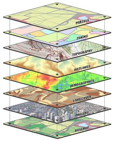 Típicamente, el fenómeno espacial se organiza en modelos de datos geoespaciales separados por tema.