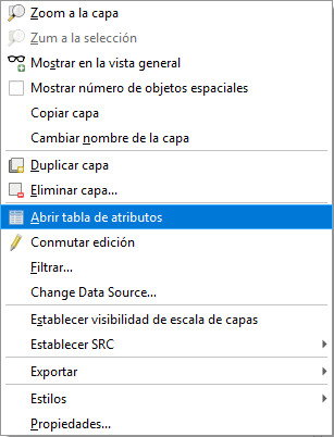 Panel de Capas. Esto abre un menú contextual. Seleccione Abrir tabla de atributos (se muestra en la figura a continuación).
