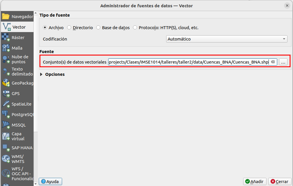 QGIS tiene distintas maneras de agregar datos para cada modelo de datos geoespaciales principales (vector y ráster). Vamos a agregar la capa vectorial de las cuencas hidrográficas de Chile.