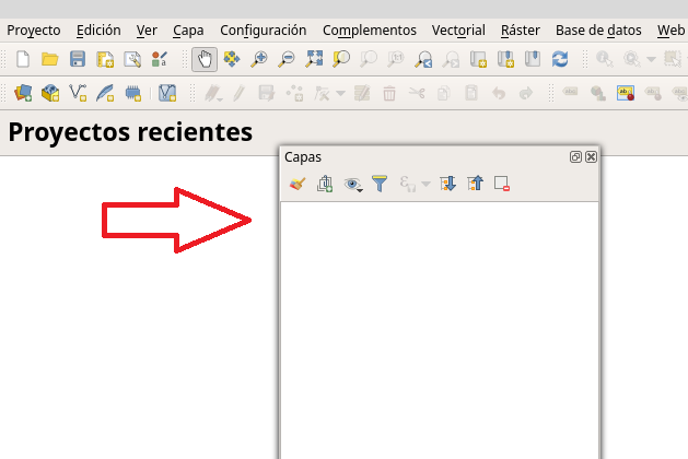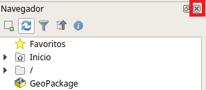 - La interfaz de QGIS la puede configurar a su gusto, por ejemplo puede cerrar algunos paneles. Por ejemplo, para cerrar el navegador localice el panel del navegador y haga clic en el pequeño botón