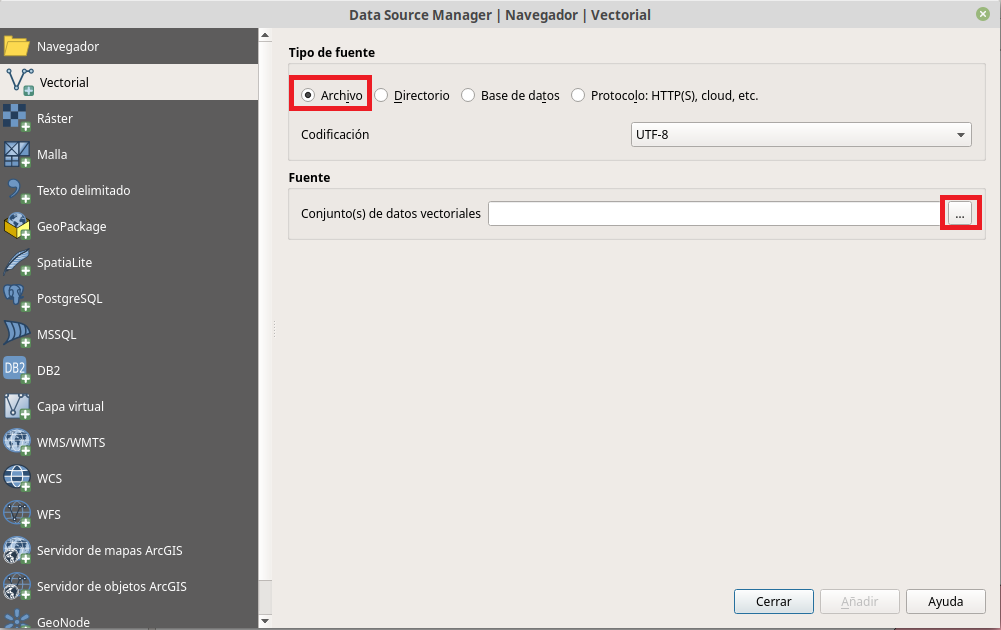 - Puede cargar una capa utiliznando el Administrador de fuentes de datos. Haga clic en el boton