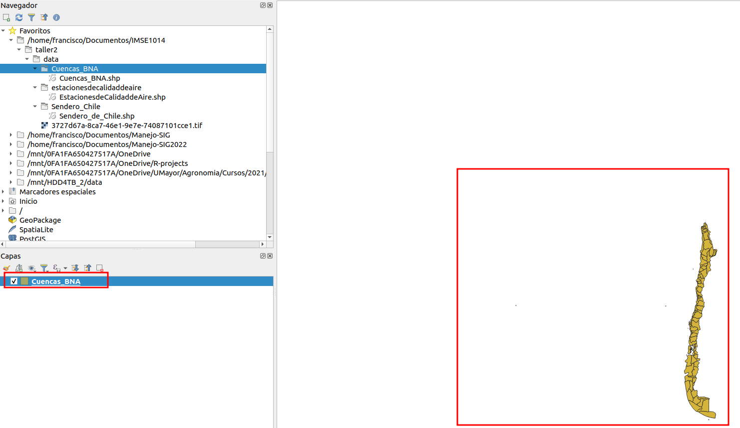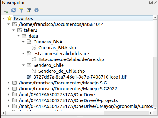 datos vectoriales: desde la IDE del Ministerio de Medio Ambiente (https://www.ide.cl/index.php/medio-ambiente) debe descargar las siguientes capas:cuencas BNA: delimitación de las cuencas hidrográficas de Chile. Descargar acáestaciones de calidad de aire: estaciones de monitoreo del Sistema de Información Nacional de Calidad de aire (SINCA) . Descargar acásendero de Chile: Conjunto de rutas que atraviesan el país, contribuyendo a la protección de la naturaleza, a través de la generación de un espacio de acceso público. Esta información se encuentra para todo el país. Descargar acádata_vectorial_taller2.gpkg: archivo en formato geopackage. Descargar acá.