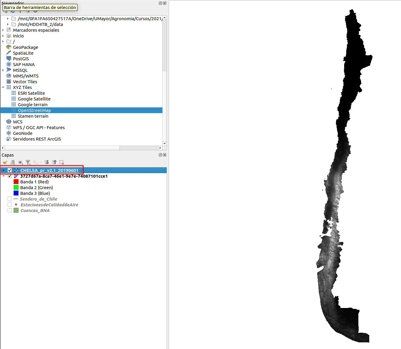 Ahora vamos a cargar otro tipo de datos raster, unos que tienen datos de precipitación y temperatura para Chile.