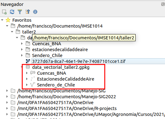 geopackageque tiene extensión “.gpkg”,data_vectorial_taller2.gpkg“. Este tipo de archivo corresponde al formato”Geopackage” https://en.wikipedia.org/wiki/GeoPackage.Haga clic en la flecha junto al archivo