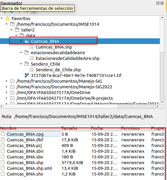Centrarse en los archivos de la carpeta Cuencas_BNA. Observe que el Árbol de archivos muestra por ejemplo el Shapefile como Cuencas_BNA.shp, mientras que la Ventana de visualización muestra cinco (o más) archivos llamados Cuencas_BNA. Estos son todos los archivos que componen el Shapefile. El árbol de archivos simplifica la vista de sus datos mostrándole solo el archivo .shp. Para obtener más información sobre los archivos de formato ESRI, consulte este enlace http://en.wikipedia.org/wiki/Shapefile