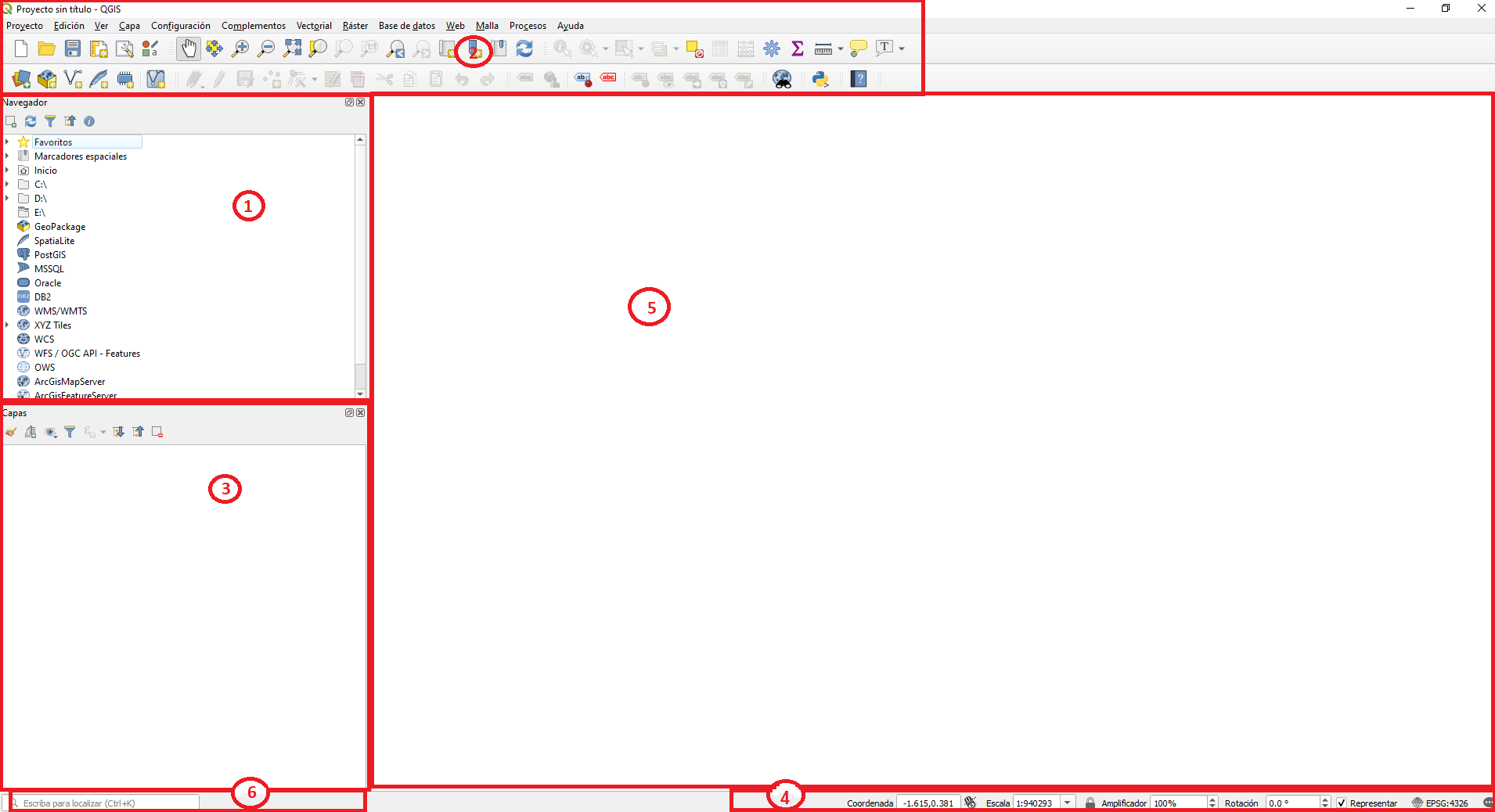 - QGIS tiene tres secciones principales: el (1) Navegador, (3) Panel Capas y el (5) lienzo del mapa.