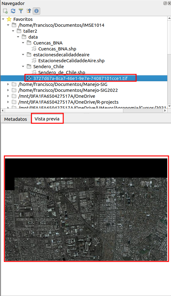 3727d67a-8ca7-46e1-9e7e-74087101cce1.tif. Haga clic en la pestaña Vista previa. Este es un ejemplo de un dataset ráster. Como una fotografía, está compuesta de celdas (pixeles). Este raster es una imagen satelital de un sector agrícola en la provincia de Talagante, Región Metropolitana (que se muestra en la figura a continuación).