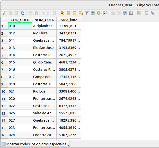 Navegadorde QGIS, tiene 139 entidades espaciales (139 polígonos). La tabla de atributos tiene 139 registros correspondientes. Hay columnas con el código de la cuenca (COD_CUEN), nombre de la cuenca (NOM_CUEN) y área en kilometros cuadrados (Area_km2). Cierre la tabla de atributos haciendo clic en el botón X en la esquina superior derecha.