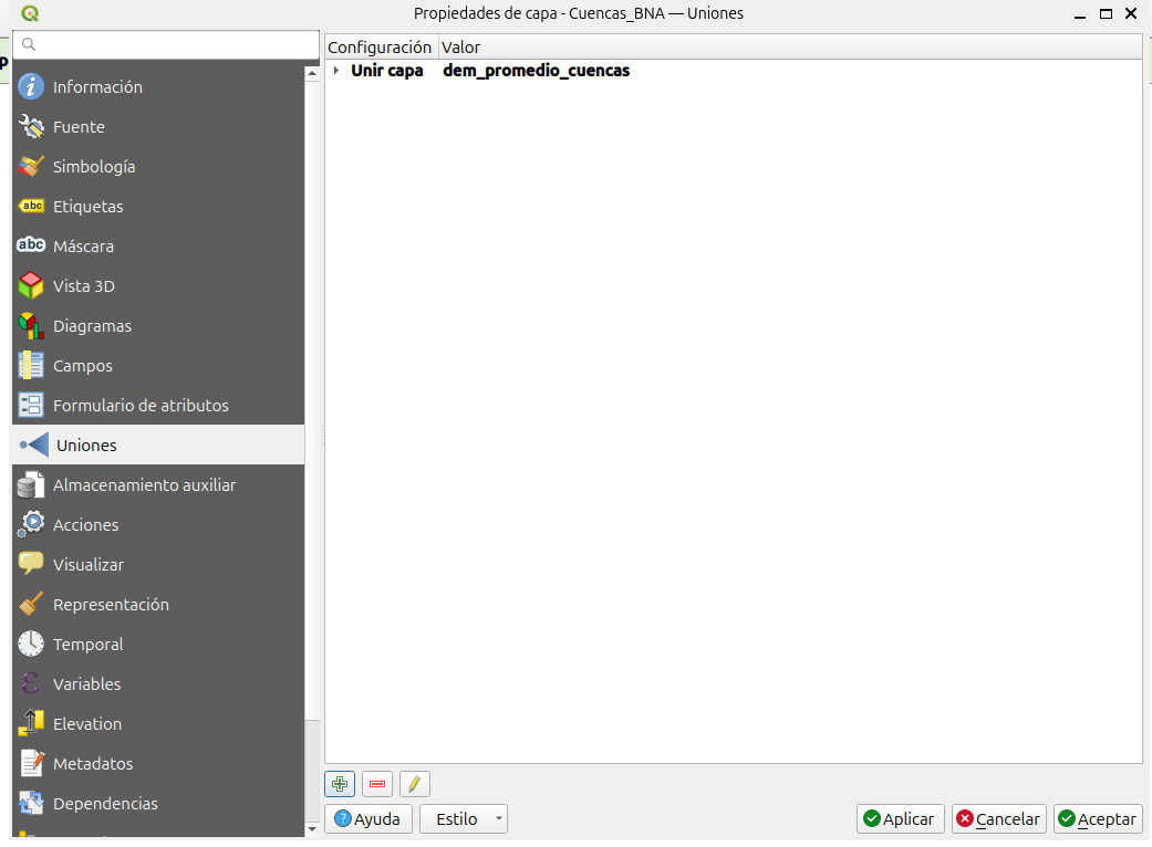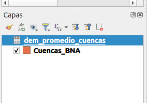 cuencas_BNAy la tabla con los datos de elevaciones. En el panel de capas de QGIS deberiamos poder ver lo siguiente: