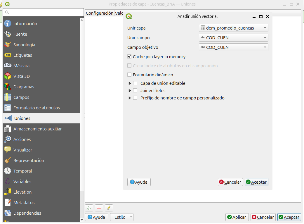 dem_promedio_cuencas. En el campoUnir capadebemos indicar la tabla con la que vamos a realizar la unión. Luego, en el campoUnir campodebemos seleccionar la columna de la tabla que vamos a utilizar como clave primaria. Finalmente, en el campoCampo objetivo, debemos indicar el campo de la capa vectorialCuencas_BNAque nos sirve para realizar la unión.En este caso debemos indicar lo siguiente: