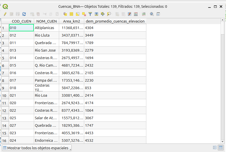 - Así tenemos un nuevo archivo vectorial de las cuencas de Chile, pero ahora con la información de la elevación promedio en cada cuenca.