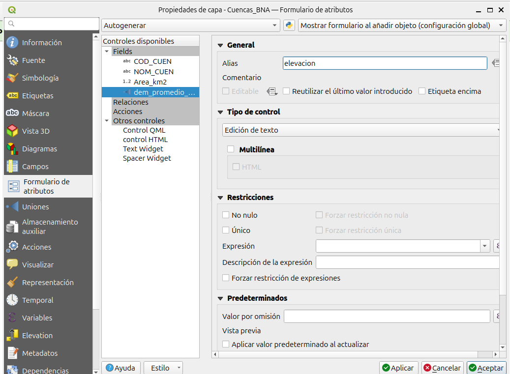Controles disponiblesvamos aFieldsy luego al campodem_promedio_cuencas_elevacion. En la secciónGeneral, dónde diceAliasescribiremos el nombre que queremos que tenga el campo, en este casoelevacion. Luego hacemos clic enAceptar. Si vemos nuevamente la tabla de atributos de la capa vectorialCuencas_BNA, veremos el nuevo nombre del campo.
