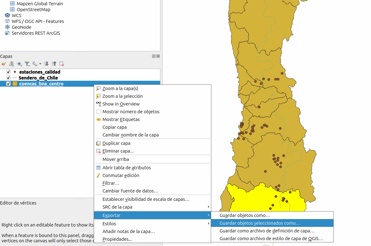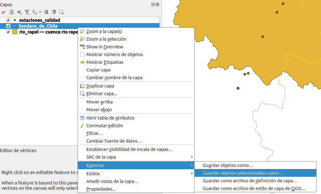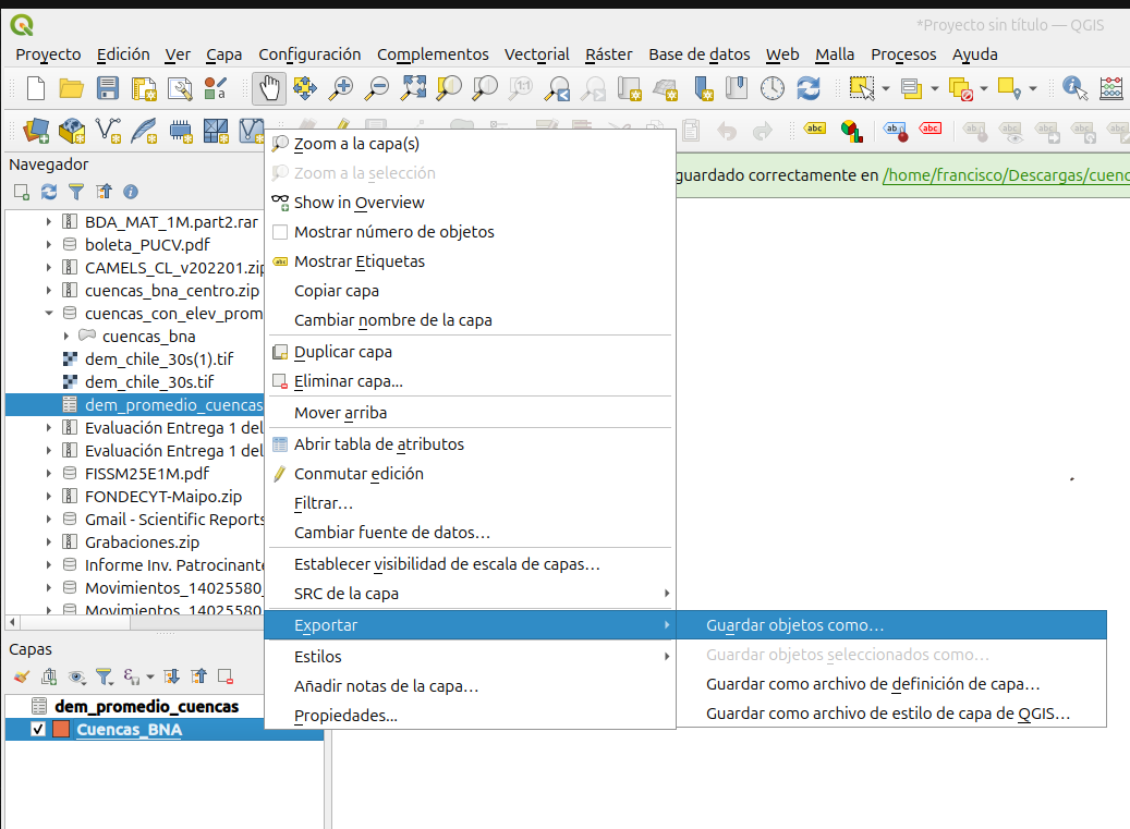 12. Ahora, de la misma forma como se guardó la cuenca del río Rapel, realizamos el proceso de guardar los objetos seleccionados.