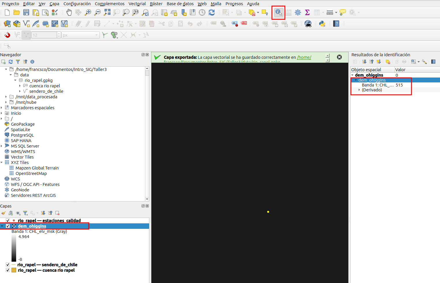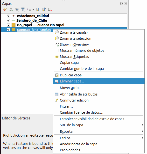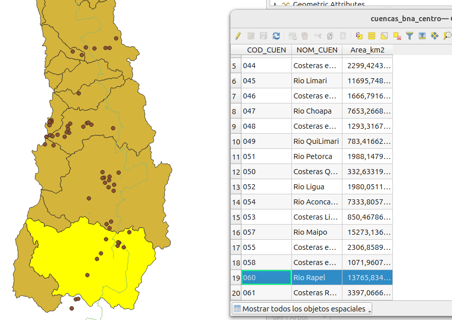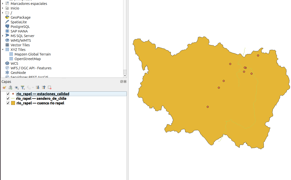 - Finalmente, deberiamos quedarnos con tres capas con objetos espaciales que se encuentran en la cuenca del río Rapel.