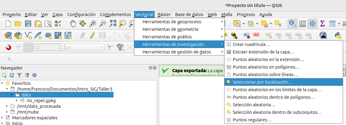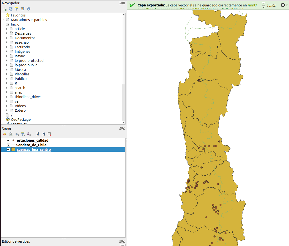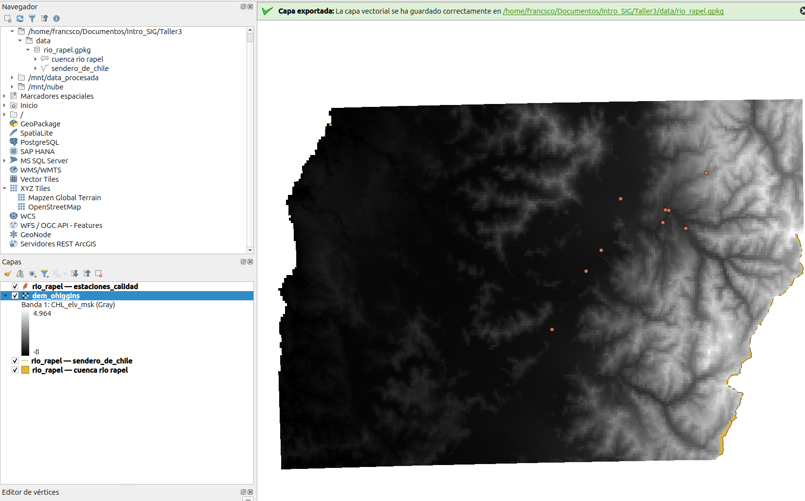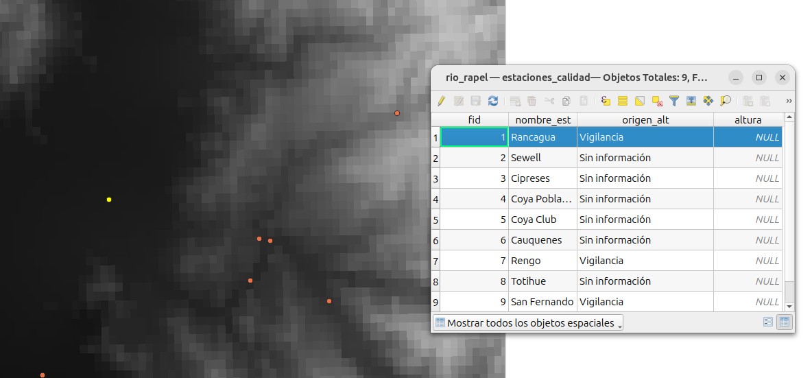 - Finalmente, deberiamos quedarnos con tres capas con objetos espaciales que se encuentran en la cuenca del río Rapel.