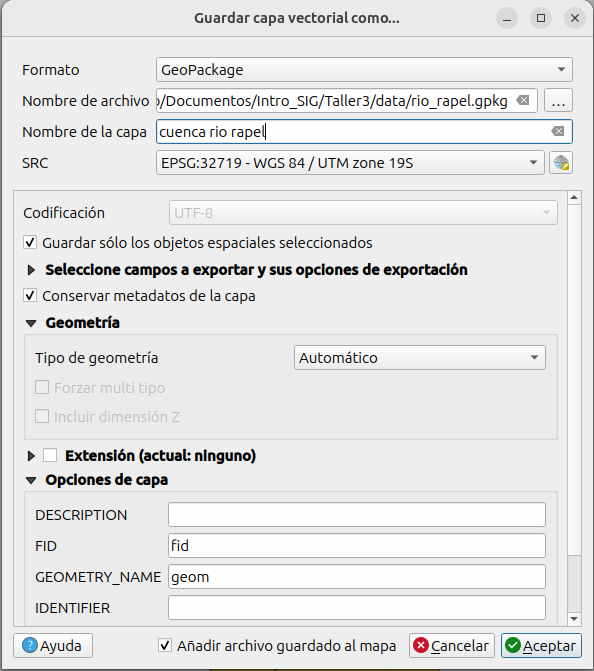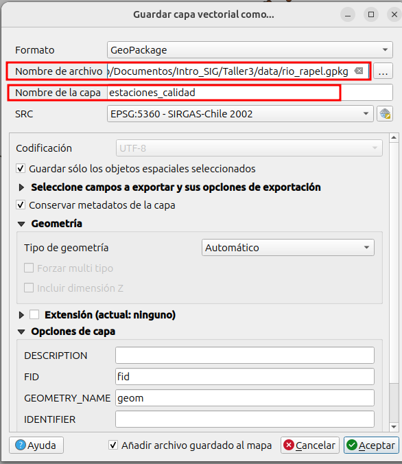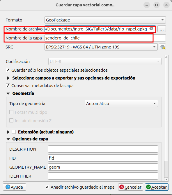 - Lo vamos a guardar en el mismo archivo GeoPackage “rio_rapel.gpkg”, pero con el nombre de capa “sendero de chile”
