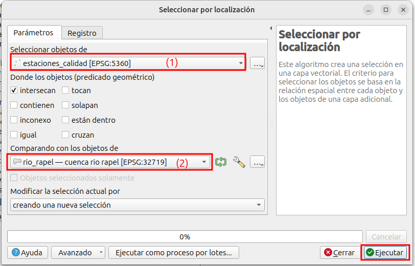 10. En el menu que se depliega, debe (1) seleccionar la capa desde la que se quieren seleccionar los objetos espaciales y (2) con respecto a que capa espacial. Por defecto QGIS realizará un proceso espacial de seleccón por intersección. Luego dar clic a (3) Aceptar.