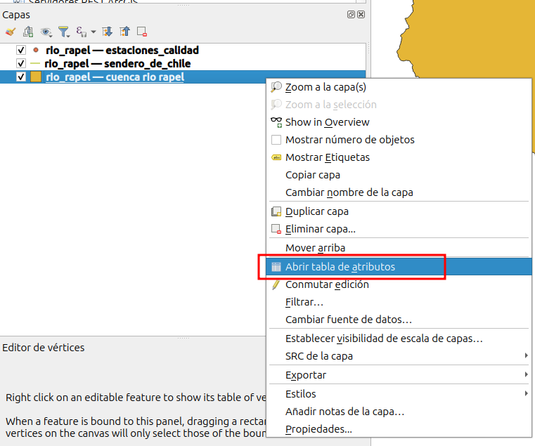 - Seleccionamos la capa “cuenca rio rapel”, haga clic con el boton derecho del mouse y seleccione abrir tabla de atributos.