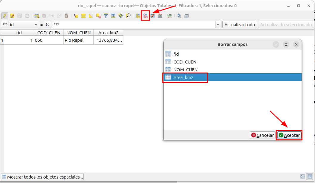 Vamos a eliminar el atributo “Area_km2”. Para eso haga clic en “elimina campo”, en la ventana que se despliega seleccione el campo “Area_km2”. De clic a “Aceptar”