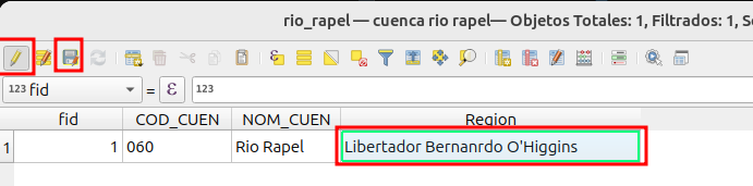 - Ahora debe hacer doble clic con el boton izquierdo del mouse en el espacio para el campo “Region” en la geometría. Debe escribir “Libertador Bernardo O’Higgins”. Luegoo haga clic en el icono “guardar” y por último desactive el conmutador de edición.
