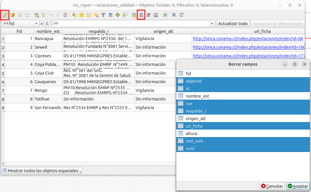 - Ahora modifique la tabla de atributos de la capa “estaciones_calidad”. Abra la tabla de atributos, conmute edición y eliminar campo. Seleccione los campos que se indican en la siguiente figura.