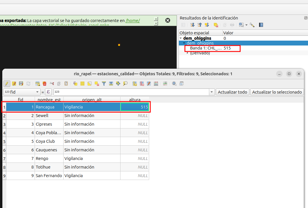 - Debe seleccionar la capa “dem_ohiggins” en el panel de capas y luego utilizar el “identificado de objetos” para que al hacer clic en la ubicación de la estación, se despliegue el valor de elevación que tiene.