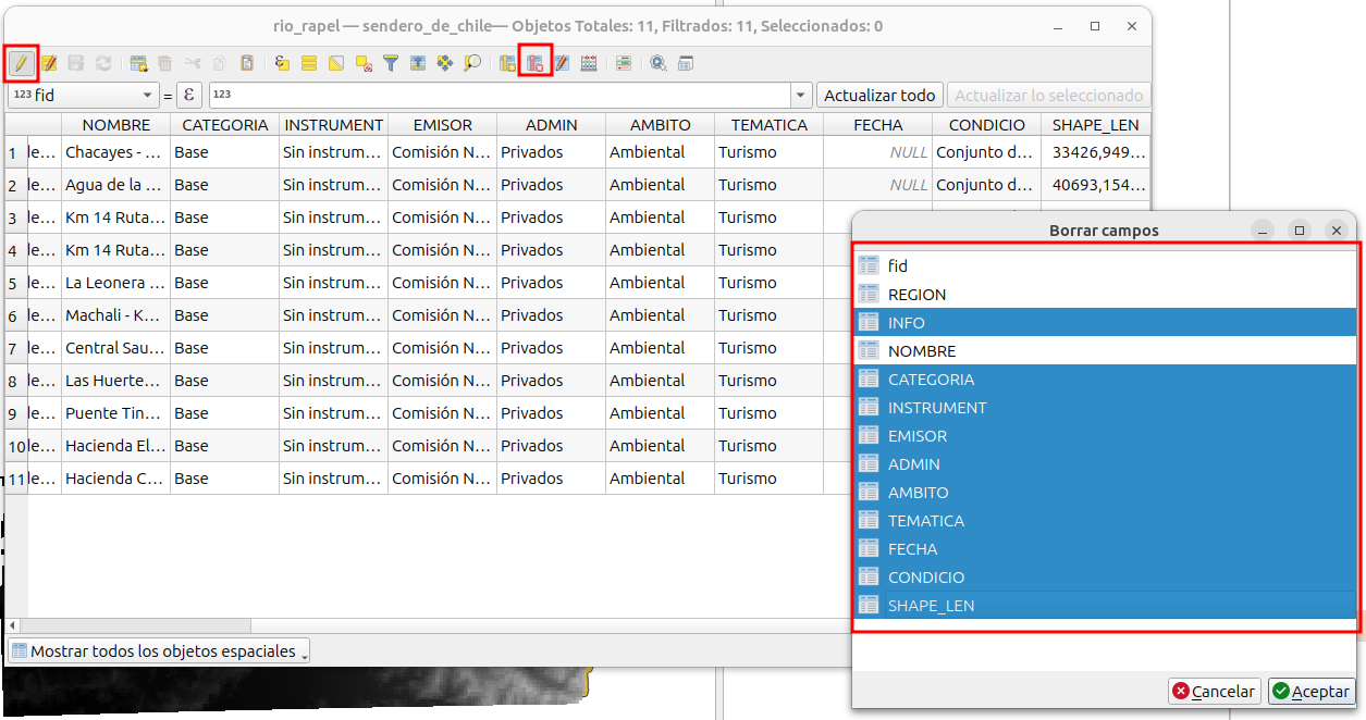 13. Por último, a la capa de “senderos de Chile”, vamos a eliminar los campos de acuerdo a como se muestra en la siguiente figura.