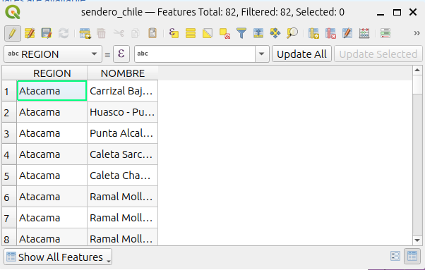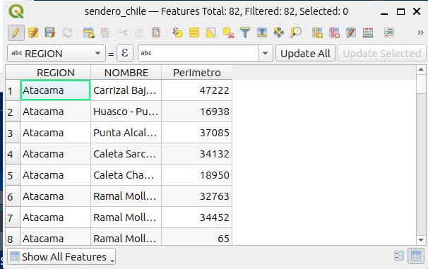 - Abra la tabla de atributos de la capa “sendero de Chile”