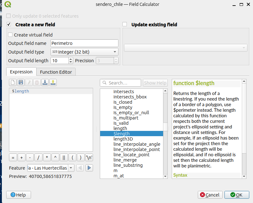 $length, que corresponde a la función que hace el cálculo del perímetro. Debe indicar un nombre para el nuevo campo, en este caso lo llamarémos “Perimetro”, debe elegir el tipo de dato que almacenara, en este caso deje el valor por defecto, entero de 32 bit. Luego debe hacer clic en “Aceptar”.