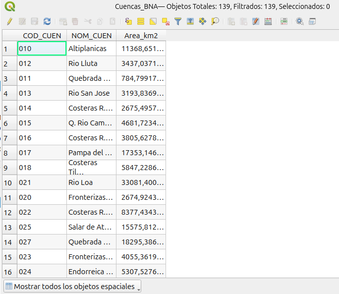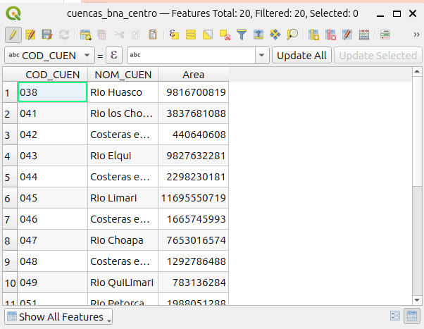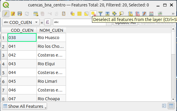 - Debe buscar en la tabla de atributos de la capa “cuencas_bna_centro” la entidad u objeto espacial que corresponde a “Río Rapel” y seleccionarla.