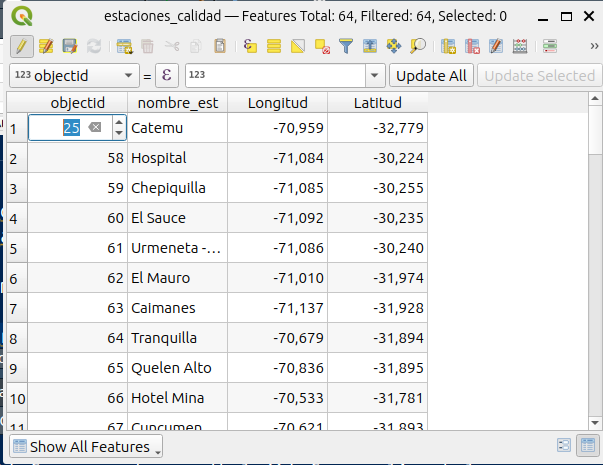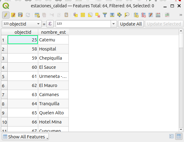 - Ahora abra la “Tabla de Atributos” de la capa “estaciones_calidad”. Para cada entidad espacial (estación) vamos a calcular su coordenada.