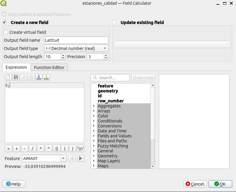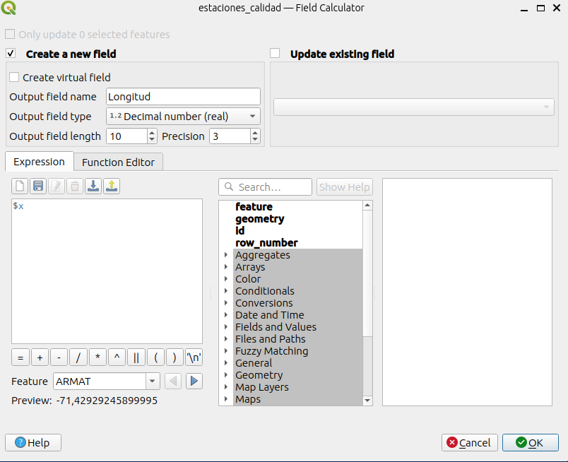 $xe$y. En el caso de la capa “estaciones_calidad” sus coordenadas se encuentran en grados decimales, por lo que el valor que vamos a obtener es en decimales. Por lo que el tipo de dato hay que definirlo como “real”.