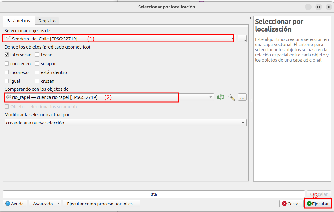 Vamos a seleccionar los objetos espaciales de la capa “sendero de Chile”, que se encuentran dentro de la cuenca del río Rapel. Por lo que vamos a hacer un proceso de “Selección por localización”