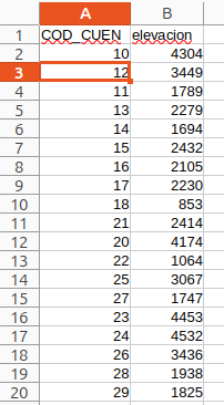 En la siguiente imagen de la izquierda se muestran los primeros veinte registros de la tabla (archivo csv) que contiene las elevaciones promedio. Por otra parte la imagen de la derecha, muestra la tabla atributos de la capa vectorial de cuencas_BNA.