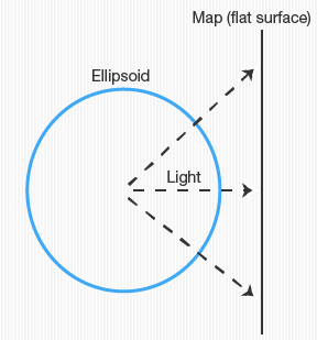 Proyección geográfica: una representación sistemática de ubicaciones desde la curva superficie terrestre sobre una superficie plana del mapa.