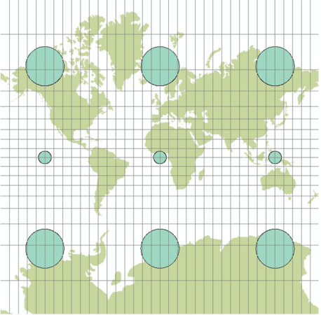 las áreas están distorsionadas significativamente a escalas pequeñas