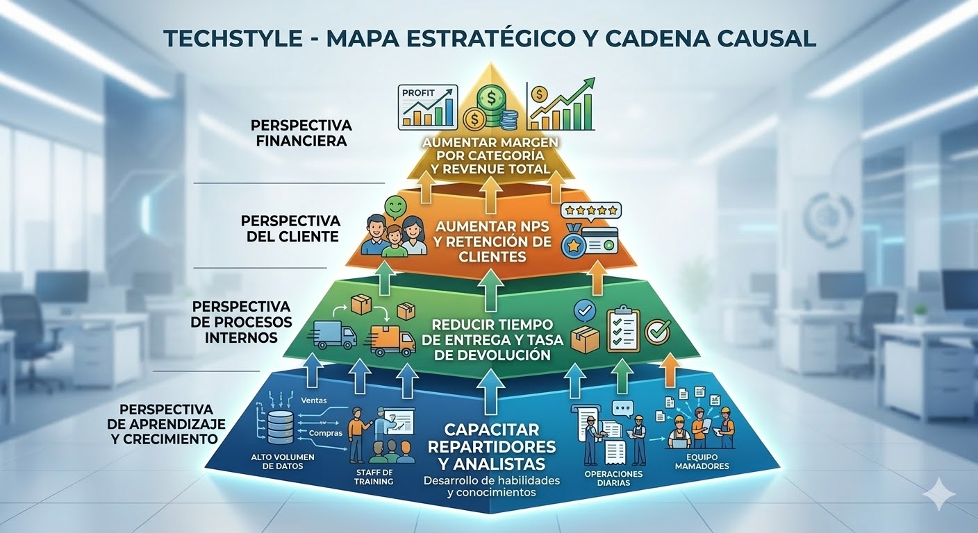 El mapa estratégico muestra que la rentabilidad de TechStyle depende de la satisfacción del cliente, que depende de los procesos, que dependen de las capacidades del equipo.