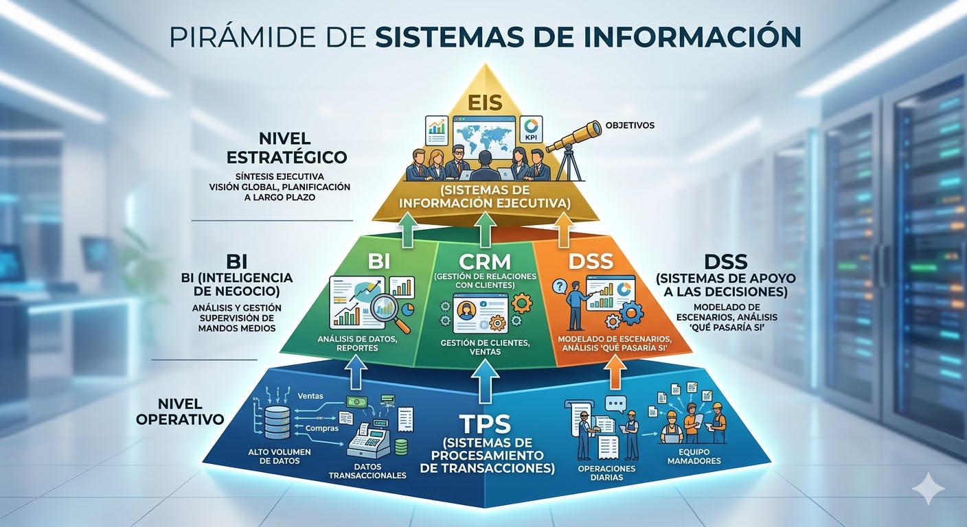 El TPS genera los datos crudos. El BI los transforma en información. El EIS presenta los KPIs estratégicos. La cadena es completa solo si cada eslabón funciona.