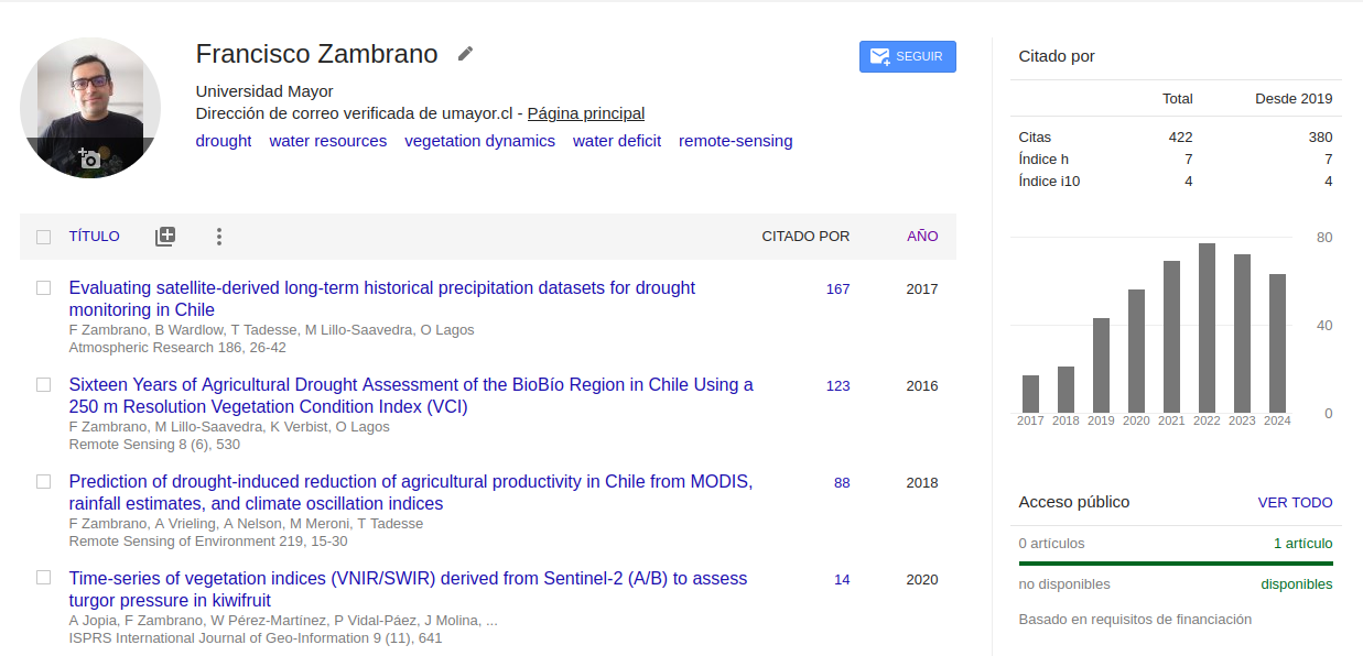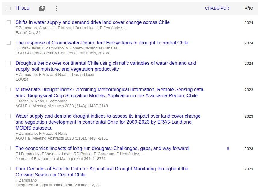 Ministerios de Obras Públicas y Agricultura de Chile, en temas relacionados con los recursos hídricos y la agricultura.Fondo de Investigación Estratégica en Sequía 2021 – REC. Director. Monto 300 $MM. odes-chileFONDEF. Director. Monto 200 $MM.FONDECYT de Iniciación en Investigación 2019. Investigador Principal. Monto ~100 $MM.ANILLO. Director Alterno. Monto ~400 $MM.FONDECYT Regular 2021. Investigador asociado. Monto ~162 $MM.FONDECYT de Postdoctorado 2023. Investigador patrocinante. Monto de ~100 $MM.Unidad 1: Procesamiento, manejo y visualización de datos espaciales con R.