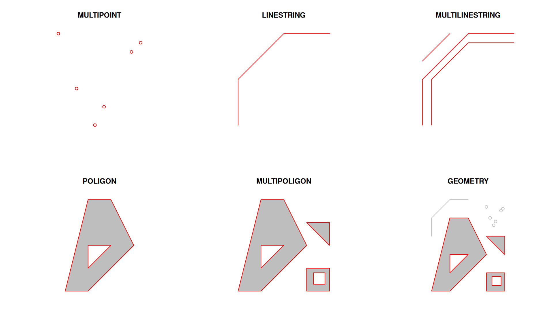 Simple Feature: se refiere a un estándar formal (ISO 19125-1: 2004) que describe cómo los objetos en el mundo real se pueden representar en computadoras, con énfasis en la geometría espacial de estos objetos.