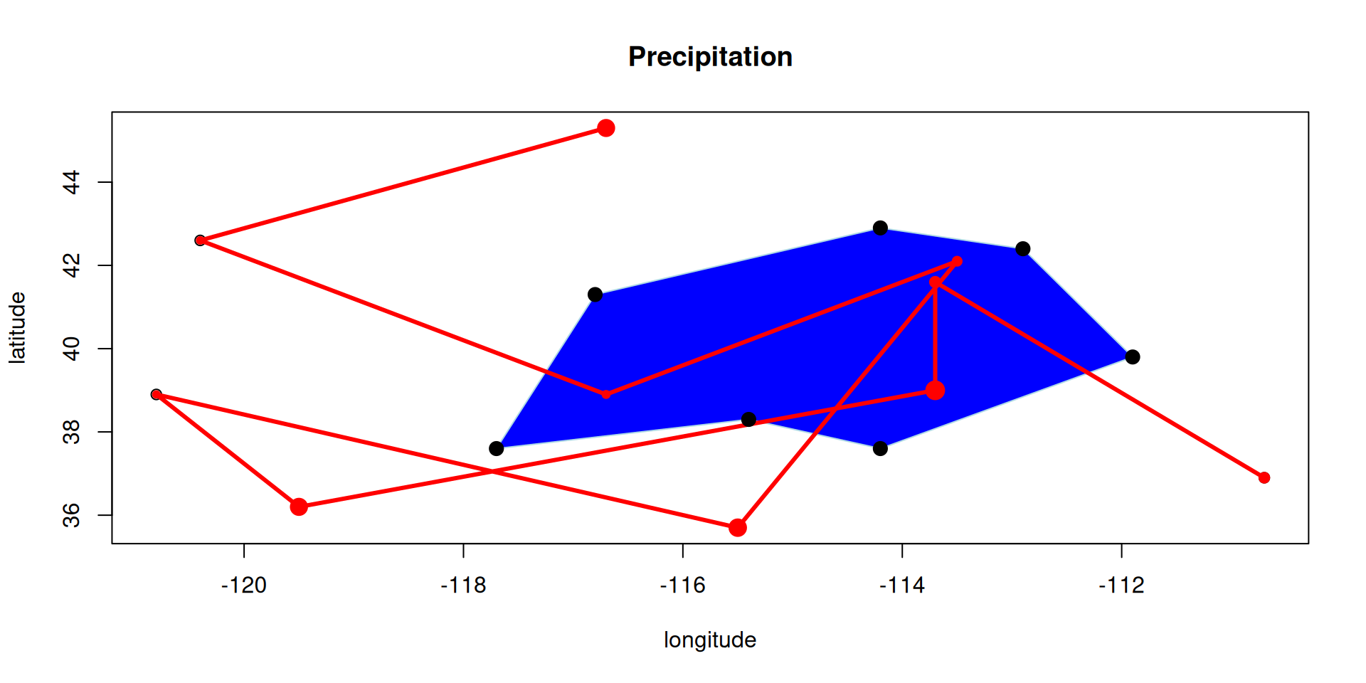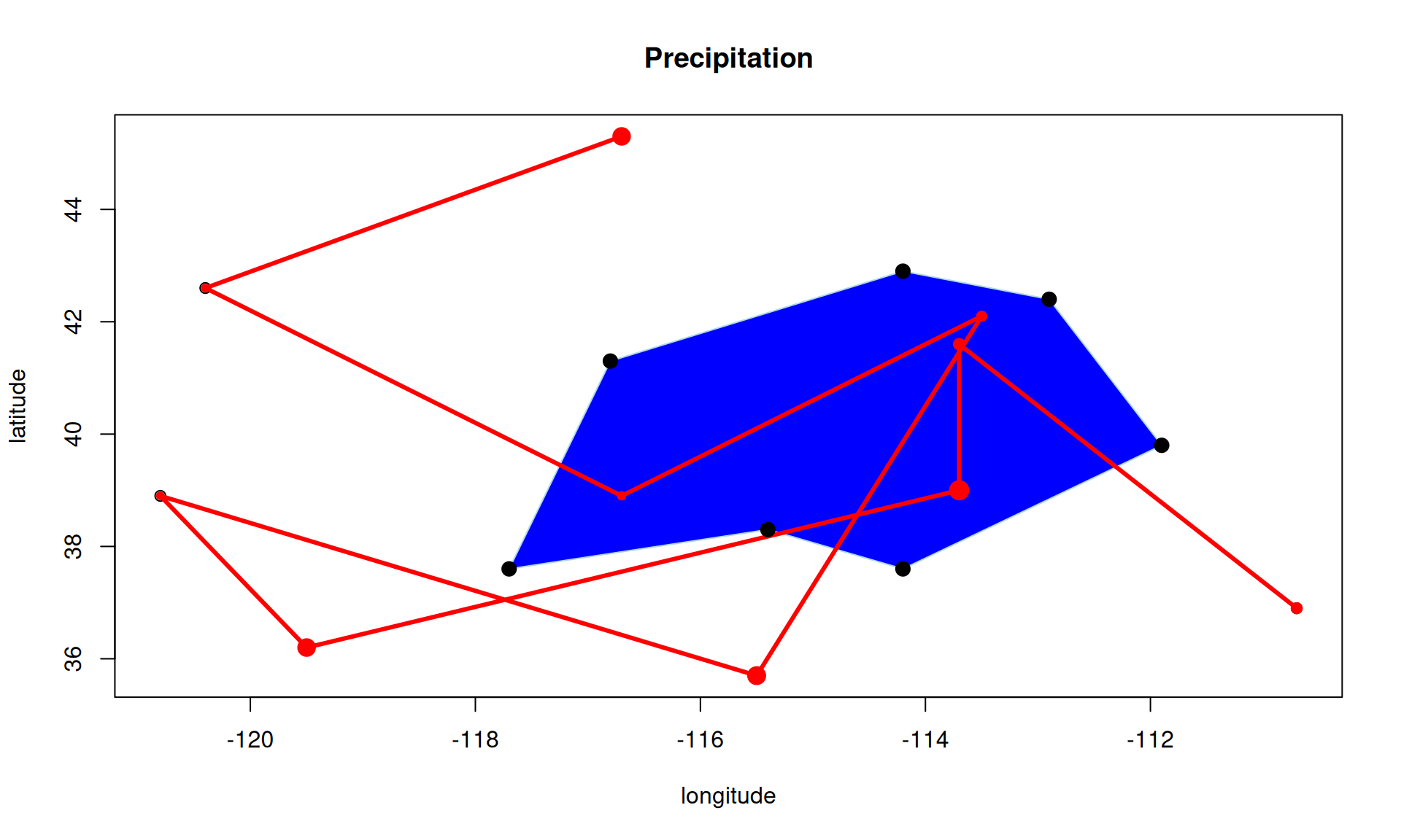 plot (stations, cex= psize, pch= 20 , col= 'red' , main= 'Precipitation' )