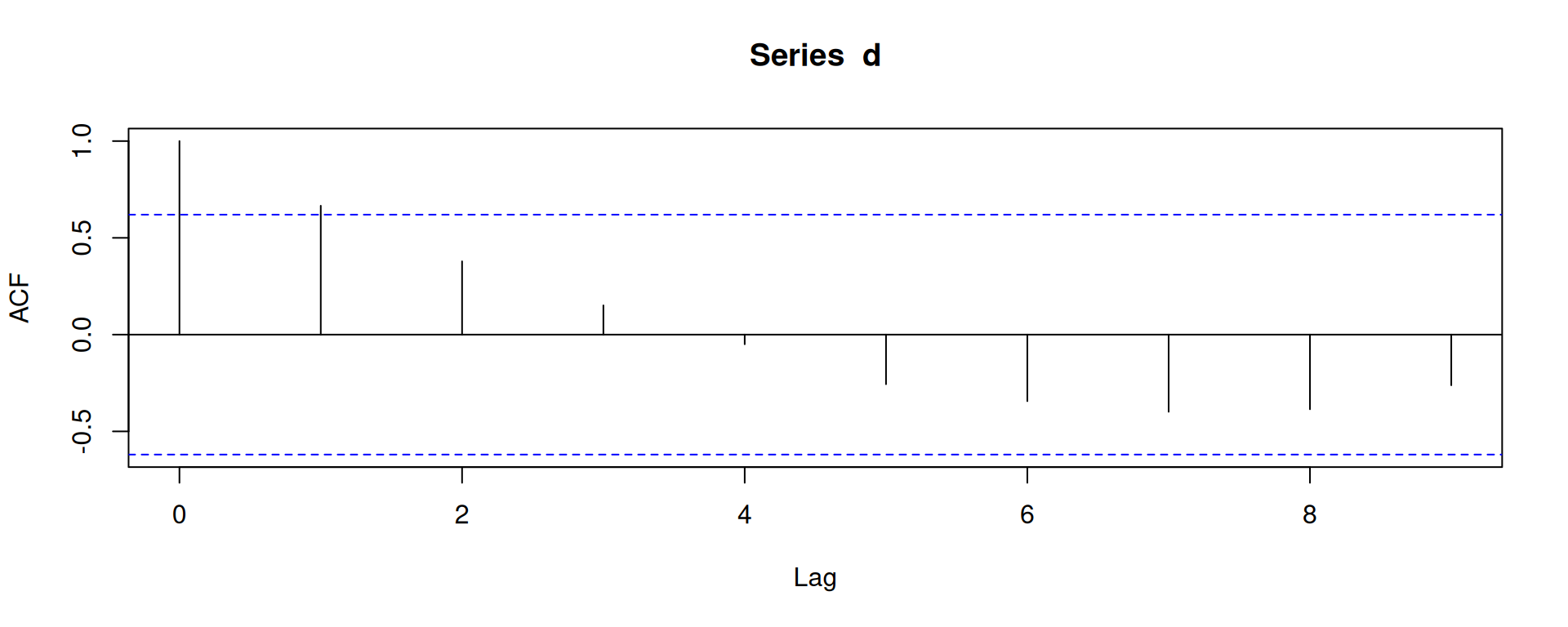 La función acf muestra la autocorrelación para diferentes desfases.