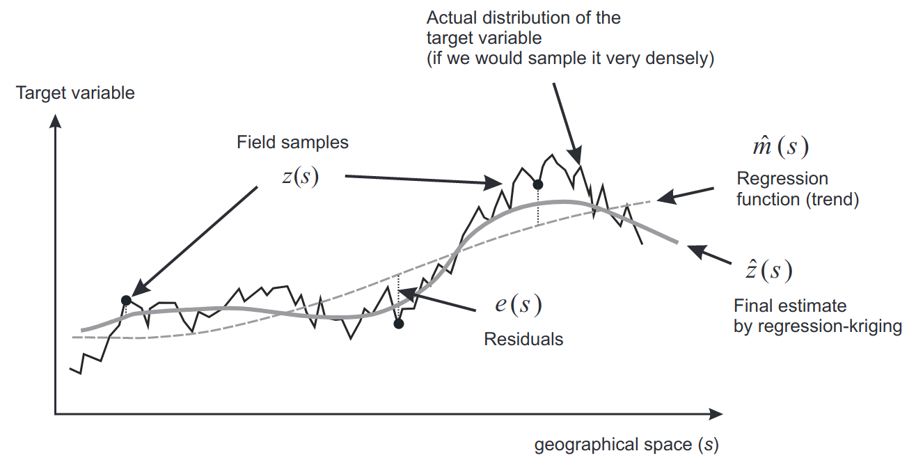 \(Z_{s_i}\) estará compuesto por una parte determinística (tendencia, ej, OLS, GLS) y la variación de la correlación espacial (variograma)